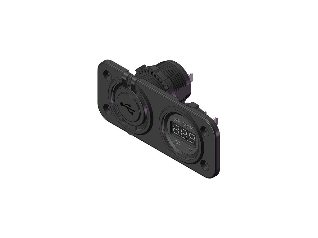 Vodotěsný panel se dvěmi otvory pro zásuvku elektronického ukazatele voltmetru a zásuvkou pro 2xUSB