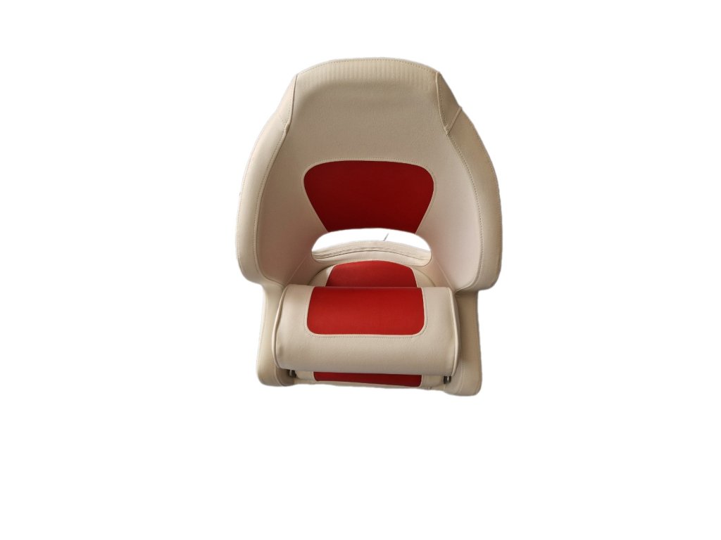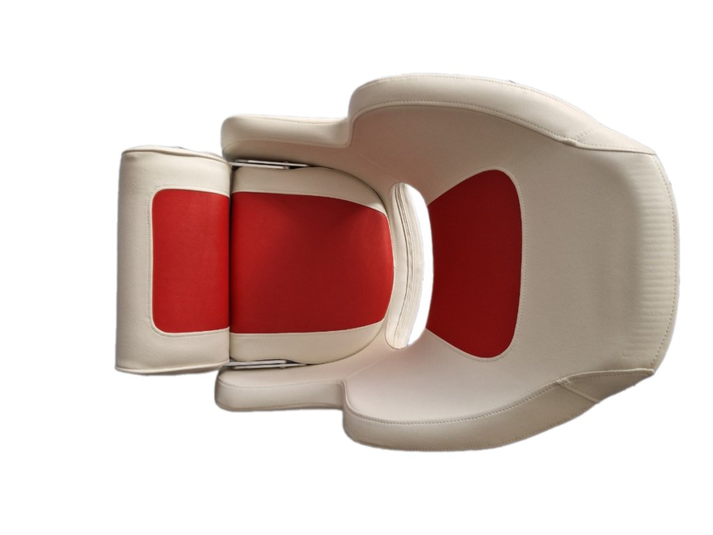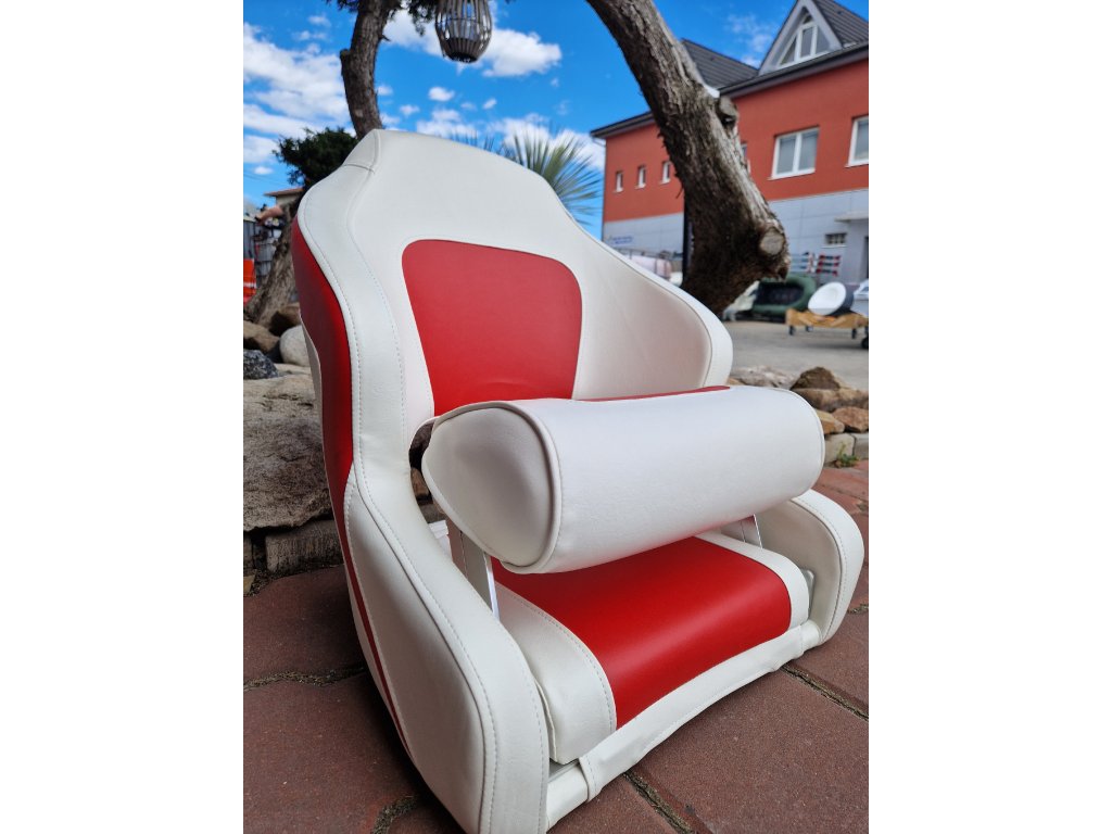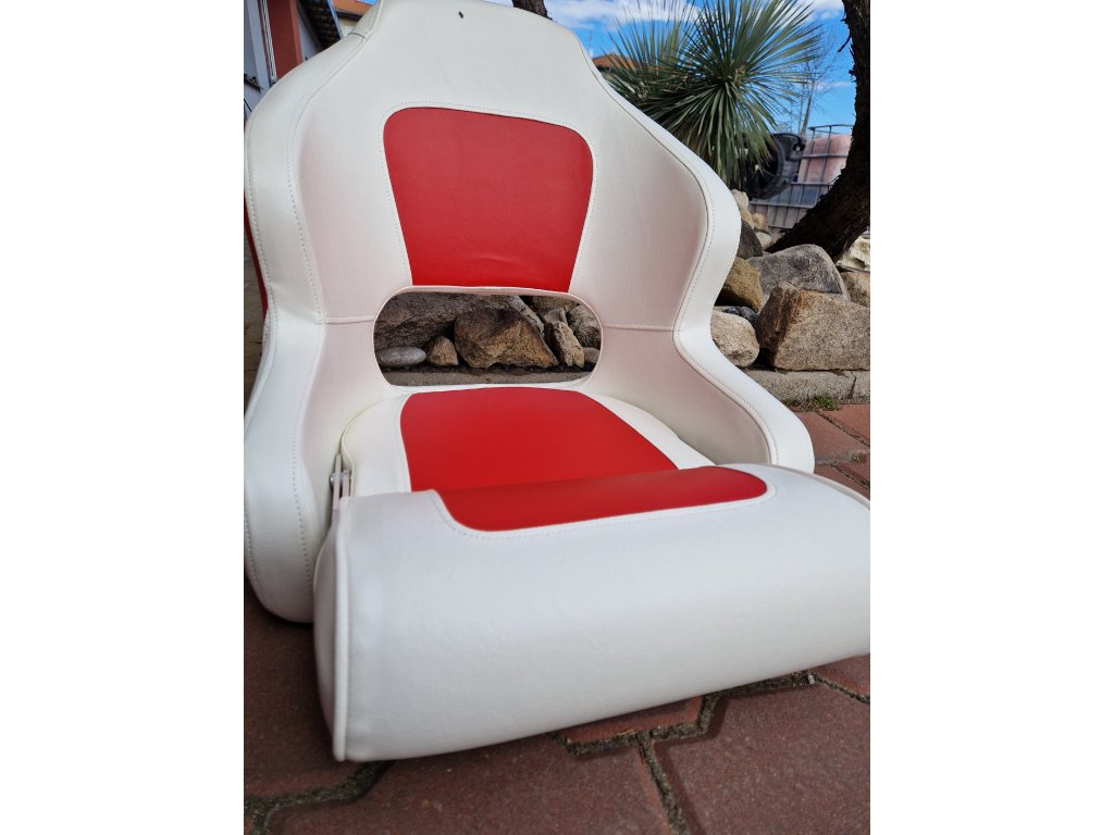 Kapitánské křeslo se zvedacím podsedákem. Sedák se dá zvednout při potřebě mít větší rozhled, např. při parkování, nebo překážek na vodě. Šířka sedáku je cca 40 cm, výška opěrky je 50 cm, když je podsedák složen dole tak je hloubka sedáku 50cm.