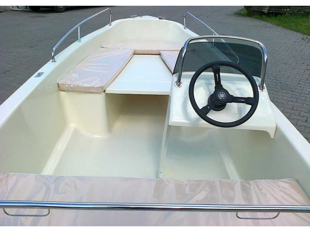 Základní výbava: bílá barva, zábradlí, čalounění skai ( imitace kůže ) na vnější straně, dálkové řízení, konzole pro řízení, plastový volant, sun deck, vazáky,