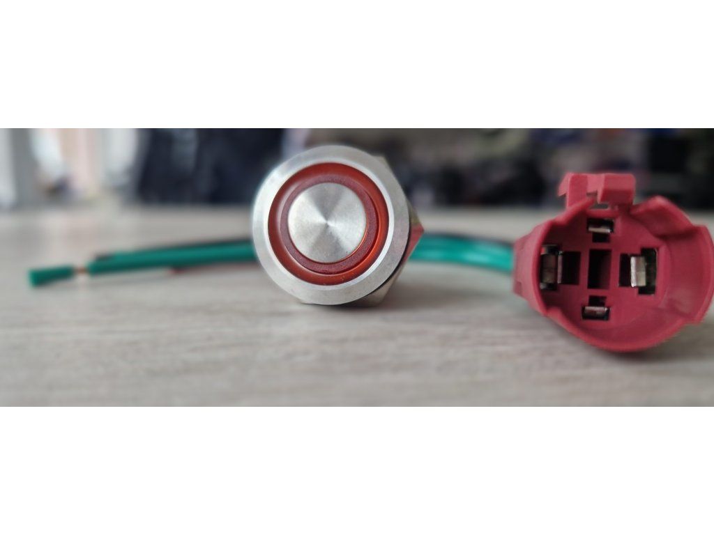 Tlačítkový spínač s pojistkou pro 12V/24V systémy, odolný vůči prachu a stříkající vodě (IP65). Červené nerezové tlačítko pro snadnou identifikaci a spolehlivé ovládání.