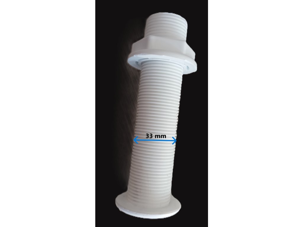 Průchodka na odtok vody délka 150 mm (řezem lze zkrátit na požadovanou délku) vnější průměr díry (co se vyřezává do trupu lodi) 34 mm.